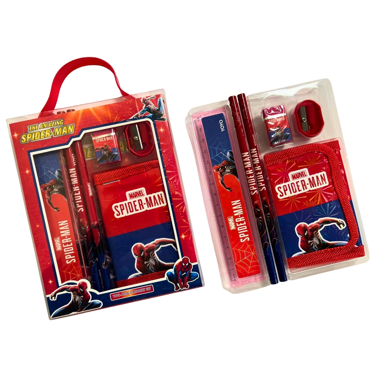 جهّز طفلك بيوم دراسي مليء بالحماس مع مجموعة أدوات سبايدرمان! تتضمن أقلام رصاص، مسطرة، ممحاة، مبراة، ومحفظة مزيّنة بشخصية سبايدرمان الشهيرة من مارفل—بدلاً من المقلمة. تصميمات مبهجة تجمع بين الألوان الحمراء والزرقاء لعشاق الأبطال الخارقين الصغار.